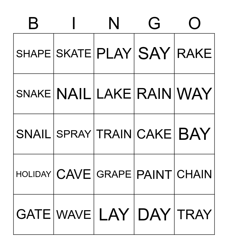 This bingo card has a free space and 24 words: CAVE, WAVE, LAKE, GATE, RAKE, SHAPE, SNAKE, SKATE, CAKE, GRAPE, RAIN, SNAIL, PAINT, CHAIN, NAIL, DAY, BAY, PLAY, WAY, SPRAY, TRAY, HOLIDAY, SAY and LAY.