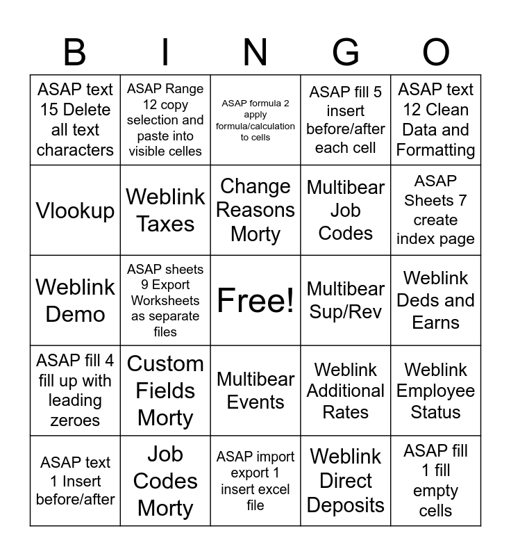 This bingo card has a free space and 24 words: Custom Fields Morty, Job Codes Morty, Change Reasons Morty, ASAP text 1 Insert before/after, ASAP text 12 Clean Data and Formatting, ASAP text 15 Delete all text characters, Vlookup, ASAP Range 12 copy selection and paste into visible celles, Multibear Sup/Rev, Multibear Events, Multibear Job Codes, Weblink Demo, Weblink Additional Rates, Weblink Employee Status, Weblink Taxes, Weblink Direct Deposits, Weblink Deds and Earns, ASAP formula 2 apply formula/calculation to cells, ASAP Sheets 7 create index page, ASAP sheets 9 Export Worksheets as separate files, ASAP fill 1 fill empty cells, ASAP fill 4 fill up with leading zeroes, ASAP fill 5 insert before/after each cell and ASAP import export 1 insert excel file.
