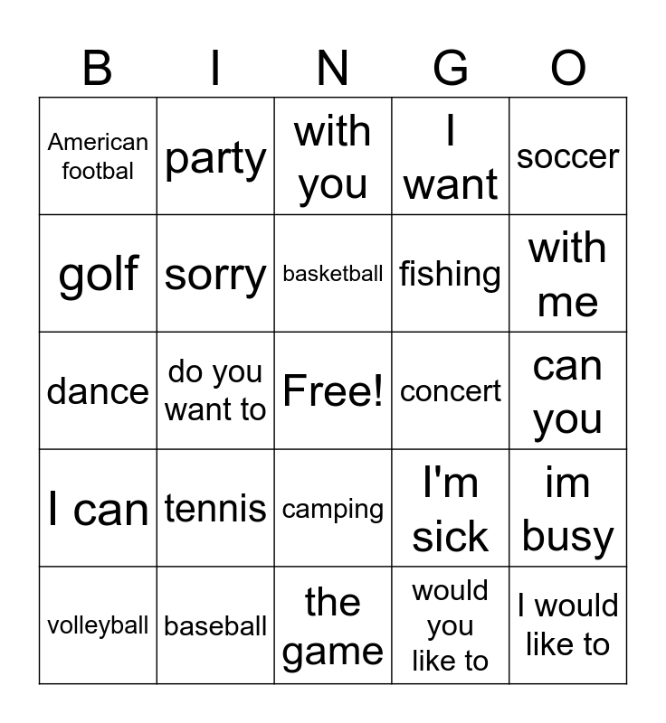 This bingo card has a free space and 24 words: tennis, baseball, basketball, volleyball, soccer, American footbal, golf, party, concert, camping, fishing, dance, I'm sick, im busy, sorry, would you like to, can you, with you, with me, do you want to, I would like to, I can, I want and the game.