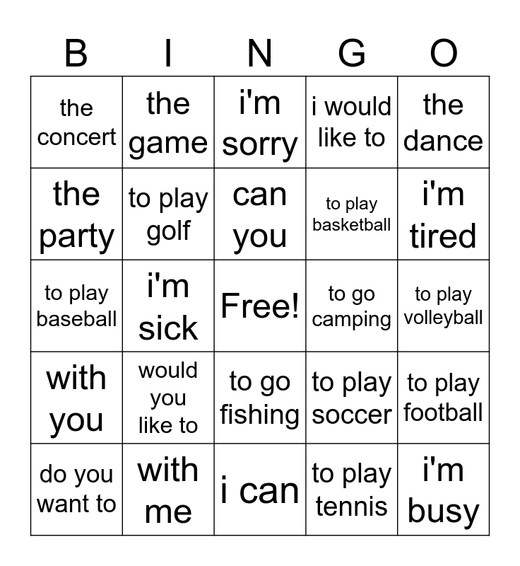This bingo card has a free space and 24 words: would you like to, with me, can you, do you want to, the dance, the concert, the party, the game, to go camping, to go fishing, to play basketball, to play baseball, to play soccer, to play football, to play golf, to play tennis, to play volleyball, i'm sorry, i'm tired, i'm sick, i'm busy, with you, i would like to and i can.