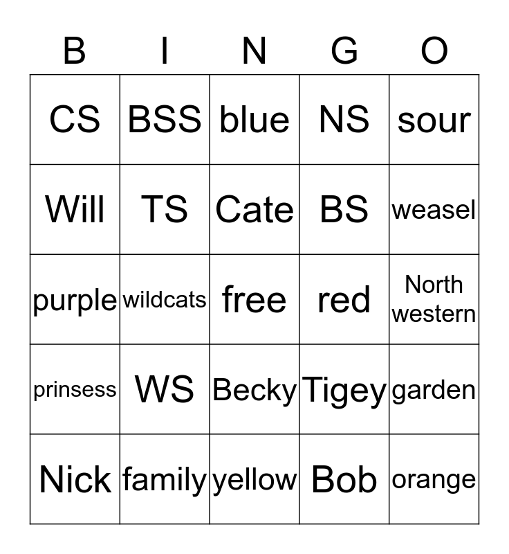 This bingo card has a free space and 24 words: WS, family, Cate, Nick, sour, CS, Will, BSS, red, Becky, BS, purple, Tigey, garden, TS, Bob, North western, blue, weasel, wildcats, orange, prinsess, NS and yellow.