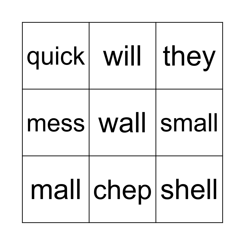 This bingo card has a free space and 8 words: small, they, will, mall, quick, shell, mess and chep.