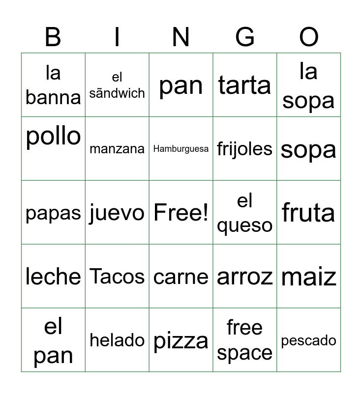 This bingo card has a free space and 25 words: Tacos, pizza, Hamburguesa, el pan, la sopa, la banna, pollo, el sãndwich, el queso, carne, frijoles, papas, arroz, maiz, manzana, dulce, fruta, pan, sopa, juevo, pescado, helado, leche, tarta and free space.