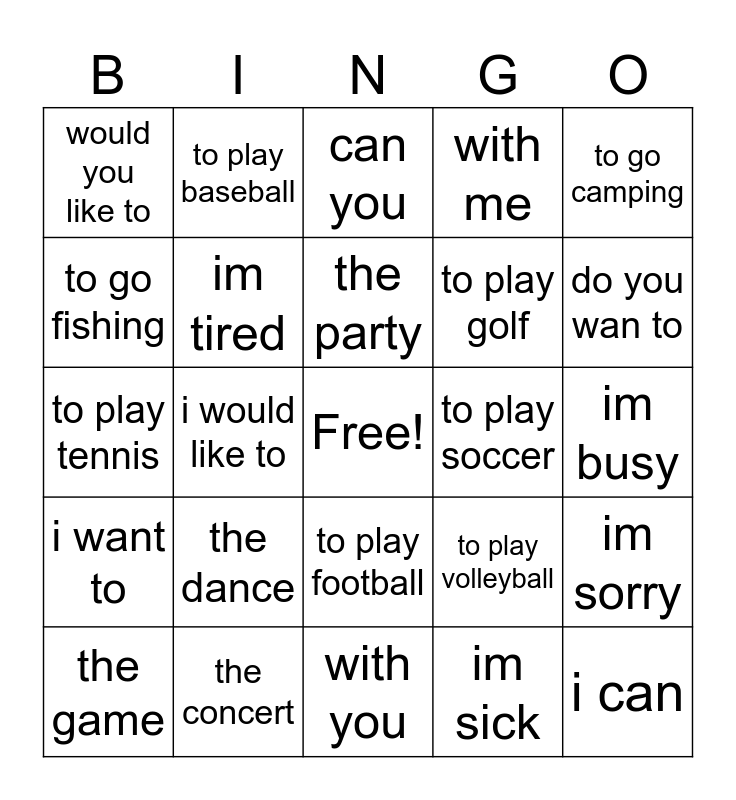 This bingo card has a free space and 24 words: the dance, the concert, the party, the game, to go camping, would you like to, to go fishing, to play baseball, to play soccer, to play football, to play golf, to play tennis, to play volleyball, im sorry, im tired, im sick, im busy, can you, do you wan to, i would like to, i can, i want to, with me and with you.
