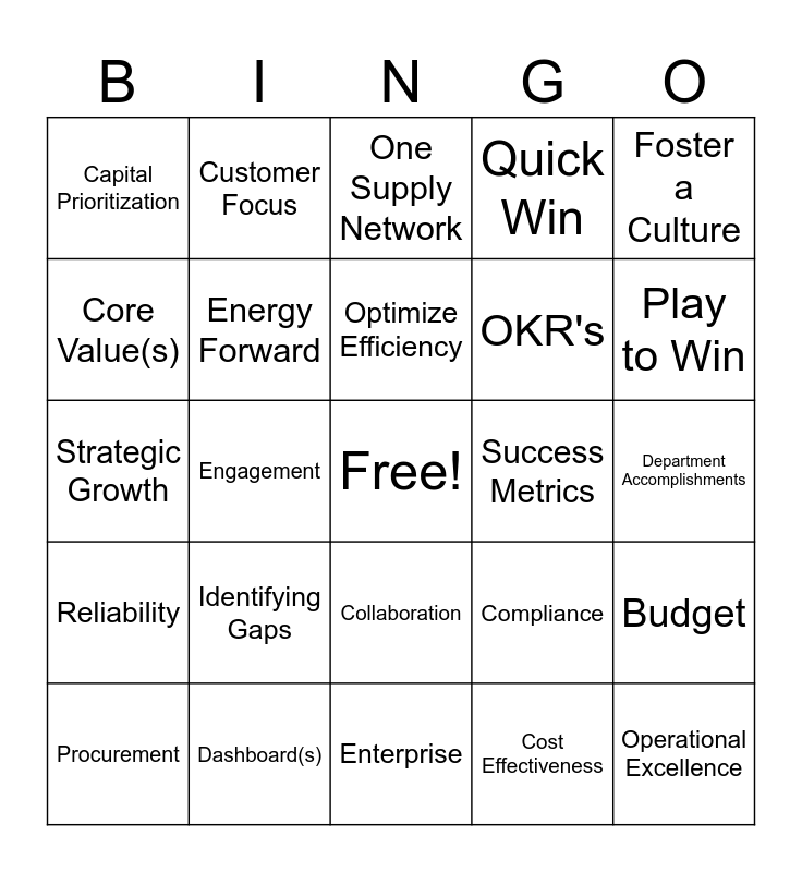 This bingo card has a free space and 24 words: Identifying Gaps, Dashboard(s), Optimize Efficiency, Procurement, Foster a Culture, Capital Prioritization, Core Value(s), Customer Focus, Success Metrics, Collaboration, OKR's, Strategic Growth, Compliance, Budget, Energy Forward, Cost Effectiveness, Department Accomplishments, One Supply Network, Play to Win, Engagement, Operational Excellence, Reliability, Quick Win and Enterprise.