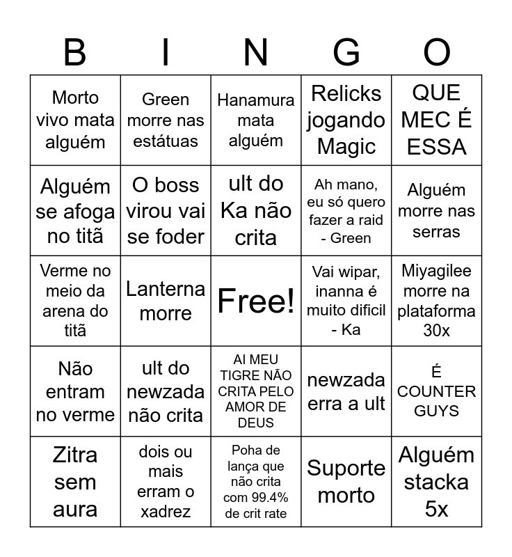 This bingo card has a free space and 24 words: ult do newzada não crita, dois ou mais erram o xadrez, ult do Ka não crita, Zitra sem aura, QUE MEC É ESSA, Morto vivo mata alguém, Alguém se afoga no titã, Green morre nas estátuas, Vai wipar, inanna é muito dificil - Ka, AI MEU TIGRE NÃO CRITA PELO AMOR DE DEUS, Ah mano, eu só quero fazer a raid - Green, Verme no meio da arena do titã, newzada erra a ult, É COUNTER GUYS, O boss virou vai se foder, Suporte morto, Miyagilee morre na plataforma 30x, Hanamura mata alguém, Alguém morre nas serras, Lanterna morre, Alguém stacka 5x, Não entram no verme, Relicks jogando Magic and Poha de lança que não crita com 99.4% de crit rate.