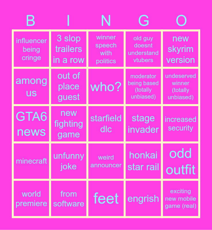 This bingo card has 25 words: unfunny joke, feet, who?, world premiere, new skyrim version, influencer being cringe, among us, 3 slop trailers in a row, stage invader, weird announcer, moderator being based (totally unbiased), GTA6 news, honkai star rail, odd outfit, out of place guest, exciting new mobile game (real), increased security, winner speech with politics, undeserved winner (totally unbiased), new fighting game, starfield dlc, from software, minecraft, old guy doesnt understand vtubers and engrish.