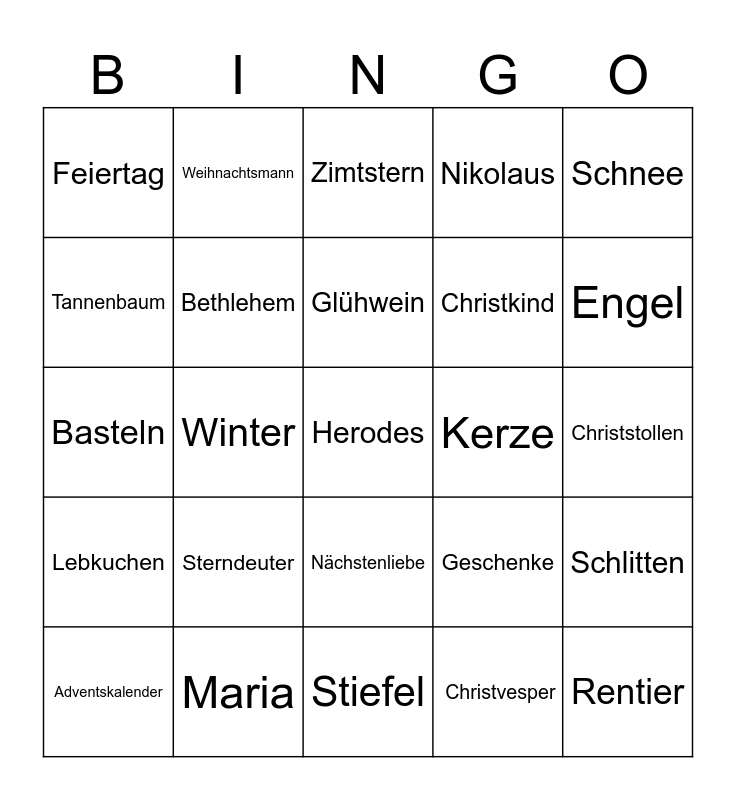 This bingo card has a free space and 53 words: Free!, Rentier, Weihnachten, Christvesper, Sterndeuter, Rudolph, Weihnachtsmann, Weihnachtsmarkt, Tannenbaum, Krippe, Bethlehem, Nazareth, Schlitten, Geschenke, Adventskranz, Adventskalender, Glühwein, Kerze, Weihnachtsstern, Schnee, Winter, Christbaumschmuck, Christkind, Feiertag, Familie, Maria, Josef, Jesus, Immanuel, Engel, Weihnachtskrippe, Krippenspiel, Gedicht, Wichtel, Weihnachtslied, Engelschor, Nikolaus, Stiefel, Zimtstern, Nuss, Vorfreude, Barbarazweige, Christstollen, Christmette, Lametta, Nächstenliebe, Maria&Josef, Jesuskind, Basteln, Lebkuchen, Gabentisch, Advent and Weihnachtskarten.