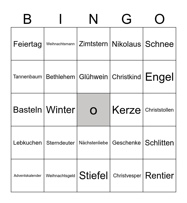 This bingo card has a free space and 53 words: Tannenduft, Rentier, Weihnachten, Christvesper, Sterndeuter, Rudolph, Weihnachtsmann, Weihnachtsmarkt, Tannenbaum, Krippe, Bethlehem, Nazareth, Schlitten, Geschenke, Adventskranz, Adventskalender, Glühwein, Kerze, Weihnachtsstern, Schnee, Winter, Christbaumschmuck, Christkind, Feiertag, Familie, Weihnachtsgeld, Wichtel, Jesus, Immanuel, Engel, Weihnachtskrippe, Krippenspiel, Gedicht, Wichtel, Weihnachtslied, Engelschor, Nikolaus, Stiefel, Zimtstern, Nuss, Vorfreude, Barbarazweige, Christstollen, Christmette, Lametta, Nächstenliebe, Maria&Josef, Jesuskind, Basteln, Lebkuchen, Gabentisch, Advent and Weihnachtskarten.
