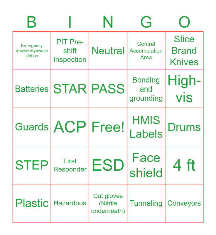 This bingo card has a free space and 34 words: Walk the line, Tunneling, Supervisor, Stretch, STEP, STAR, Slice Brand Knives, Plastic, PIT Pre-shift Inspection, Penguin, PASS, Neutral, LOTO, Hot Work Permit, HMIS Labels, High-vis, Hazardous, Guards, First Responder, Face shield, ESD, Entanglement Hazard, Emergency Shower/eyewash station, Drums, Cut gloves (Nitrile underneath), Conveyors, Central Accumulation Area, C or D, Bonding and grounding, Batteries, Attended, ACP, 4 ft and 3 ft.