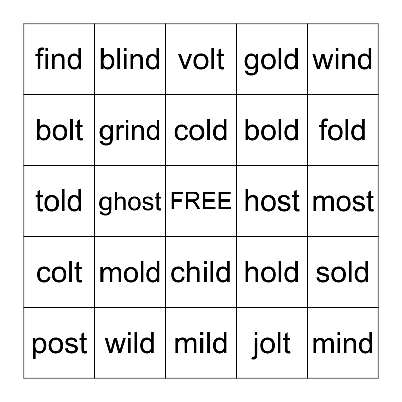This bingo card has a free space and 24 words: mold, wild, cold, post, wind, find, bolt, blind, host, child, bold, told, hold, sold, grind, jolt, most, volt, fold, ghost, mind, colt, gold and mild.