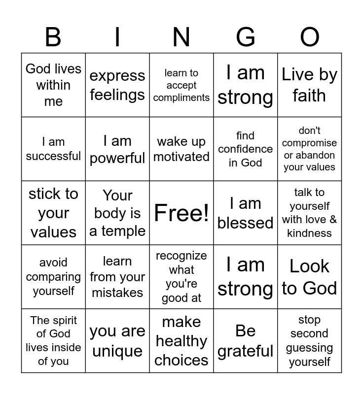 This bingo card has a free space and 49 words: realize that you're not your circumstances, stop second guessing yourself, journal and confront your thought, make healthy choices, learn from your mistakes, let negative people go, express feelings, master a new skill, I am successful, I am confident, I am powerful, I am strong, Look to God, I am strong, Live in the word not the world, Be Kind, wake up motivated, I am blessed, I have a purpose, Live by faith, Your body is a temple, Be grateful, God lives within me, find confidence in God, surround yourself with people who love and get you, don't compromise or abandon your values, The spirit of God lives inside of you, shift your focus from outcomes to growth, recognize what you're good at, avoid comparing yourself, don't please others or conform, celebrate your accomplishments, set small goals and achieve them, pick up an ignored hobby or learn something new, you are unique, forgive yourself and any past mistakes, be proud of yourself, identify your needs, wants, and hopes, talk to yourself with love & kindness, recognize and identify negative thoughts, say positive affirmations, set boundaries, identify the things you can & cannot control, practive ways to create calm and peace within, stick to your values, learn to accept compliments, develop a daily gratitude practice, take control of your own feelings and pray.