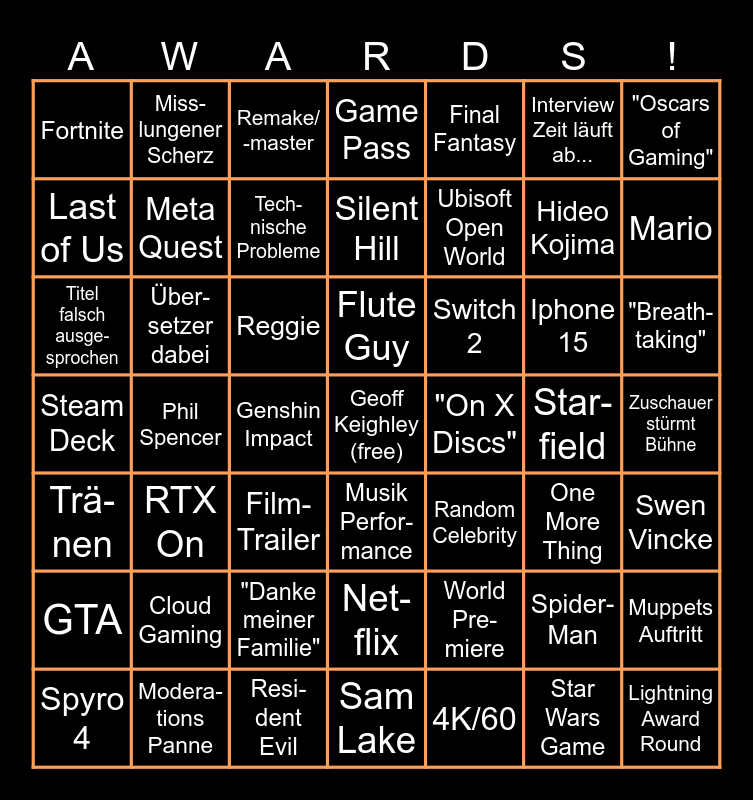 This bingo card has a free space and 48 words: World Pre-miere, Hideo Kojima, Sam Lake, Phil Spencer, Reggie, Zuschauer stürmt Bühne, Miss-lungener Scherz, Modera-tions Panne, Interview Zeit läuft ab..., Musik Perfor-mance, "Oscars of Gaming", Game Pass, Iphone 15, Switch 2, GTA, Star-field, Last of Us, Mario, Spider-Man, Final Fantasy, Ubisoft Open World, Genshin Impact, Fortnite, Meta Quest, Muppets Auftritt, Tech-nische Probleme, "Breath-taking", Spyro 4, Flute Guy, Über-setzer dabei, Star Wars Game, "On X Discs", Swen Vincke, Cloud Gaming, Steam Deck, Random Celebrity, One More Thing, Titel falsch ausge-sprochen, Film- Trailer, "Danke meiner Familie", Trä-nen, Lightning Award Round, Remake/ -master, Resi-dent Evil, Silent Hill, Net-flix, RTX On and 4K/60.