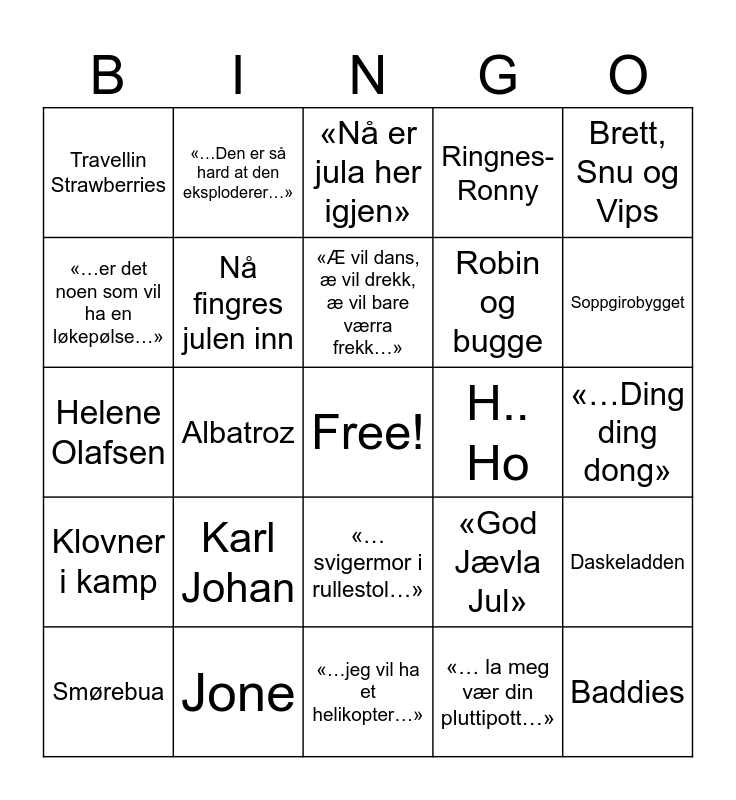This bingo card has a free space and 28 words: Daskeladden, BEIST, Robin og bugge, «… la meg vær din pluttipott…», «…er det noen som vil ha en løkepølse…», «Nå er jula her igjen», «…Den er så hard at den eksploderer…», Klovner i kamp, H.. Ho, Smørebua, Helene Olafsen, Ringnes-Ronny, Jone, «…jeg vil ha et helikopter…», Soppgirobygget, Mr. Pimp lotion, Karl Johan, Nå fingres julen inn, «Æ vil dans, æ vil drekk, æ vil bare værra frekk…», «…svigermor i rullestol…», Travellin Strawberries, Jesu bror, Baddies, Albatroz, «…Ding ding dong», «God Jævla Jul», Brett, Snu og Vips and Vassendguttane.