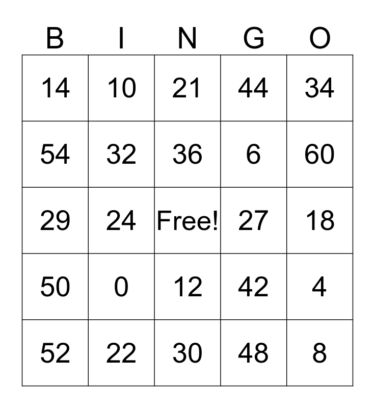 This bingo card has a free space and 24 words: 0, 22, 36, 52, 34, 14, 54, 10, 27, 12, 6, 29, 42, 4, 32, 48, 18, 21, 60, 24, 8, 50, 44 and 30.