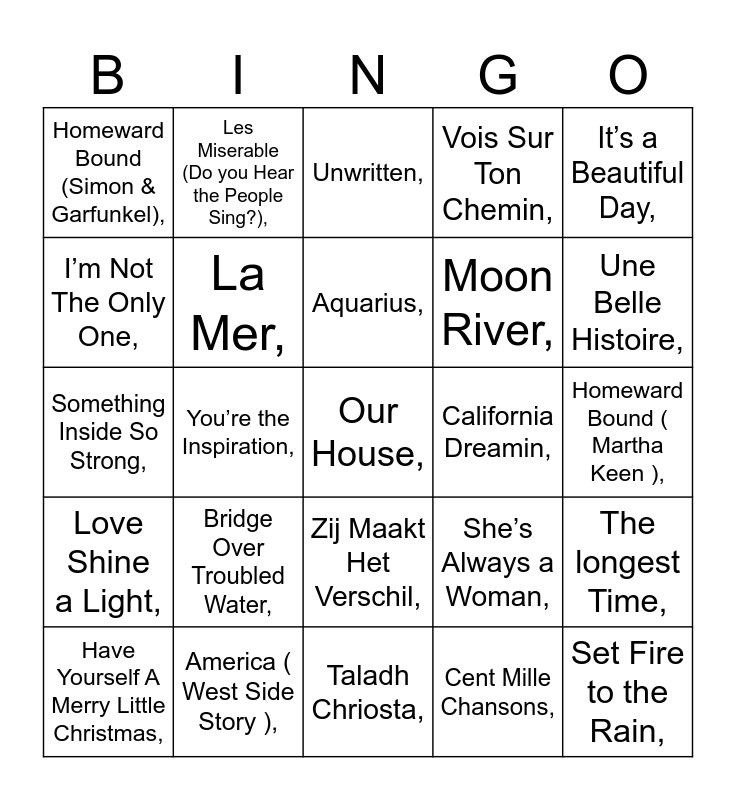 This bingo card has 75 words: Free!, Last Christmas,, Unwritten,, Africa,, L’oiseau et L’enfant,, Super Trouper,, Tears in Heaven,, Ameno,, Just Give Me a Reason,, Thank You For The Music,, Set Fire to the Rain,, Home,, Aquarius,, I’m Not The Only One,, Viva La Vida,, You’re the Inspiration,, Ave Verum,, Our House,, The Rose,, It’s a Beautiful Day,, For No One,, Something Inside So Strong,, La Mer,, Les Miserable (Do you Hear the People Sing?),, Vois Sur Ton Chemin,, Man in the Mirror,, Do-Re-Mi,, Joyful Joyful,, Somebody To Love,, Angels,, Fix You,, Precious Lord,, Wat voor weer zou het zijn in Den Haag?,, She’s Always a Woman,, Une Belle Histoire,, Moon River,, I Feel Pretty,, Plaisir d’Amour,, Homeward Bound ( Martha Keen ),, Cent Mille Chansons,, Mr. Blue Sky,, Un Deux Trois,, Your Song,, Stand By Me,, Calypso Carol,, It’s Summertime,, Have Yourself A Merry Little Christmas,, Homeward Bound (Simon & Garfunkel),, Morning Has Broken,, I Say a Little Prayer,, A Brand New Day,, Zij Maakt Het Verschil,, Bad Day,, Everything,, I Don’t Believe In Miracles,, Long Time Ago In Bethlehem,, I Will follow Him,, When You Believe,, Someone Like You,, Angel’s Carol,, Bridge Over Troubled Water,, Deck The Hall,, I Could Have Danced,, Underneath Your Clothes,, Liston To The Music,, California Dreamin,, Turning Tables,, An Irish Blessing,, The Rhythm Of Live,, The longest Time,, Love Shine a Light,, America ( West Side Story ),, I Heard The Bells On Christmas,, Taladh Chriosta, and Santa Claus Is Coming To Town,.