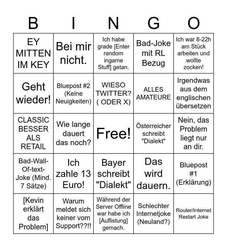 This bingo card has a free space and 24 words: Ich zahle 13 Euro!, Warum meldet sich keiner vom Support??!!, WIESO TWITTER? ( ODER X), [Kevin erklärt das Problem], Ich war 8-22h am Stück arbeiten und wollte zocken!, EY MITTEN IM KEY, Geht wieder!, Bei mir nicht., Österreicher schreibt "Dialekt", Bayer schreibt "Dialekt", ALLES AMATEURE, CLASSIC BESSER ALS RETAIL, Das wird dauern., Bluepost #1 (Erklärung), Bluepost #2 (Keine Neuigkeiten), Schlechter Internetjoke (Neuland?), Nein, das Problem liegt nur an dir., Ich habe grade [Enter random ingame Stuff] getan., Irgendwas aus dem englischen übersetzen, Wie lange dauert das noch?, Router/Internet Restart Joke, Bad-Wall-Of-text-Joke (Mind. 7 Sätze), Bad-Joke mit RL Bezug and Während der Server Offline war habe ich [Auflistung] gemach..