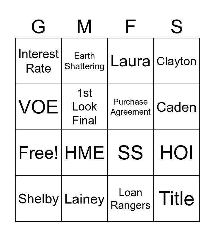 This bingo card has 20 words: HOI, Doug, Laura, Alisa, Shelby, VOE, Lainey, Interest Rate, Free!, Earth Shattering, HME, SS, 1st Look Final, Title, Purchase Agreement, DTI, Caden, Clayton, Loan Rangers and Clear to Close.