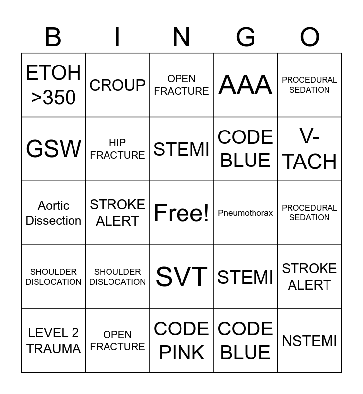 This bingo card has a free space and 196 words: STEMI, NSTEMI, LEVEL 1 TRAUMA, LEVEL 2 TRAUMA, GSW, SVT, V-TACH, A-FIB, A-FIB RVR, CODE BLUE, CODE PINK, STROKE ALERT, HEAD BLEED, ANAPHYLAXIS, STAB WOUND, ROLLOVER MVC, CROUP, ASTHMA EXACERBATION, ETOH >350, HIP FRACTURE, SHOULDER DISLOCATION, PROCEDURAL SEDATION, AAA, Aortic Dissection, OPEN FRACTURE, RESTRAINTS, Pneumothorax, Open Fracture, STEMI, NSTEMI, LEVEL 1 TRAUMA, LEVEL 2 TRAUMA, GSW, SVT, V-TACH, A-FIB, A-FIB RVR, CODE BLUE, CODE PINK, STROKE ALERT, HEAD BLEED, ANAPHYLAXIS, STAB WOUND, ROLLOVER MVC, CROUP, ASTHMA EXACERBATION, ETOH >350, HIP FRACTURE, SHOULDER DISLOCATION, PROCEDURAL SEDATION, AAA, Aortic Dissection, OPEN FRACTURE, RESTRAINTS, Pneumothorax, Open Fracture, STEMI, NSTEMI, LEVEL 1 TRAUMA, LEVEL 2 TRAUMA, GSW, SVT, V-TACH, A-FIB, A-FIB RVR, CODE BLUE, CODE PINK, STROKE ALERT, HEAD BLEED, ANAPHYLAXIS, STAB WOUND, ROLLOVER MVC, CROUP, ASTHMA EXACERBATION, ETOH >350, HIP FRACTURE, SHOULDER DISLOCATION, PROCEDURAL SEDATION, AAA, Aortic Dissection, OPEN FRACTURE, RESTRAINTS, Pneumothorax, Open Fracture, STEMI, NSTEMI, LEVEL 1 TRAUMA, LEVEL 2 TRAUMA, GSW, SVT, V-TACH, A-FIB, A-FIB RVR, CODE BLUE, CODE PINK, STROKE ALERT, HEAD BLEED, ANAPHYLAXIS, STAB WOUND, ROLLOVER MVC, CROUP, ASTHMA EXACERBATION, ETOH >350, HIP FRACTURE, SHOULDER DISLOCATION, PROCEDURAL SEDATION, AAA, Aortic Dissection, OPEN FRACTURE, RESTRAINTS, Pneumothorax, Open Fracture, STEMI, NSTEMI, LEVEL 1 TRAUMA, LEVEL 2 TRAUMA, GSW, SVT, V-TACH, A-FIB, A-FIB RVR, CODE BLUE, CODE PINK, STROKE ALERT, HEAD BLEED, ANAPHYLAXIS, STAB WOUND, ROLLOVER MVC, CROUP, ASTHMA EXACERBATION, ETOH >350, HIP FRACTURE, SHOULDER DISLOCATION, PROCEDURAL SEDATION, AAA, Aortic Dissection, OPEN FRACTURE, RESTRAINTS, Pneumothorax, Open Fracture, STEMI, NSTEMI, LEVEL 1 TRAUMA, LEVEL 2 TRAUMA, GSW, SVT, V-TACH, A-FIB, A-FIB RVR, CODE BLUE, CODE PINK, STROKE ALERT, HEAD BLEED, ANAPHYLAXIS, STAB WOUND, ROLLOVER MVC, CROUP, ASTHMA EXACERBATION, ETOH >350, HIP FRACTURE, SHOULDER DISLOCATION, PROCEDURAL SEDATION, AAA, Aortic Dissection, OPEN FRACTURE, RESTRAINTS, Pneumothorax, Open Fracture, STEMI, NSTEMI, LEVEL 1 TRAUMA, LEVEL 2 TRAUMA, GSW, SVT, V-TACH, A-FIB, A-FIB RVR, CODE BLUE, CODE PINK, STROKE ALERT, HEAD BLEED, ANAPHYLAXIS, STAB WOUND, ROLLOVER MVC, CROUP, ASTHMA EXACERBATION, ETOH >350, HIP FRACTURE, SHOULDER DISLOCATION, PROCEDURAL SEDATION, AAA, Aortic Dissection, OPEN FRACTURE, RESTRAINTS, Pneumothorax and Open Fracture.