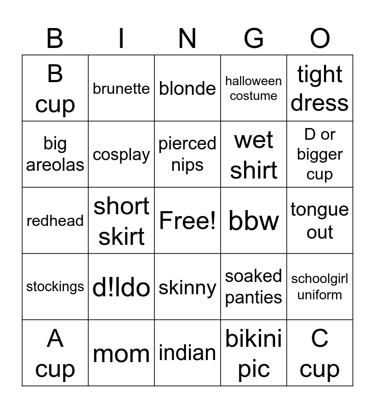 This bingo card has a free space and 24 words: d!ldo, mom, pierced nips, A cup, tight dress, B cup, big areolas, brunette, bbw, skinny, wet shirt, redhead, soaked panties, schoolgirl uniform, cosplay, bikini pic, tongue out, blonde, D or bigger cup, short skirt, C cup, stockings, halloween costume and indian.