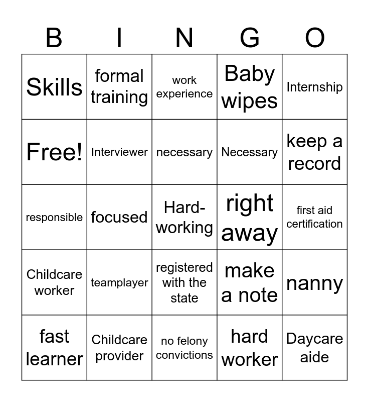 This bingo card has 62 words: Childcare assistant, Childcare provider, I'm available from, Childcare worker, Daycare aide, Employer, Interviewer, Full time employee, Necessary, Part time employee, Baby wipes, Crip, Free!, High-chair, Resume, Skills, Hard-working, Internship, Interviewer, necessary, right away, work experience, fast learner, hard worker, honest, reliable, au pair, babysitter, nanny, preschool teacher, CCP certification, CDA certification, community college, CPR, first aid certification, formal training, graduate, application, focused, hard-working, responsible, tactful, teamplayer, keep a log, keep a record, make a note, record each child’s progress, record milestones, licensed, pass a background check, registered with the state, no felony convictions, no drug-related convictions, have up-to-date immunizations, change diapers, develop schedules and routines, give baths, monitor play activities, observe play activities, organize activities, organize mealtimes and prepare meals.