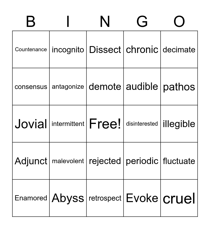 This bingo card has a free space and 62 words: Abhor, Abyss, Accolade, Adjunct, Affidavit, Affinity, antagonize, antipathy, audible, belligerent, chronic, circumvent, consensus, controversy, Copious, Countenance, cruel, decimate, demographic, demote, disinterested, Dissect, Enamored, Evoke, Excessive, exorbitant, Famished, fidelity, fluctuate, forecast, genocide, hatred, Heedless, hindsight, illegible, incognito, inducement, Instill, intermittent, interrogate, Jovial, loquacious, malevolent, nominal, pathos, periodic, posterity, precursor, prognosis, protracted, rejected, retrospect, sophisticated, subordinate, synthesis, synthesize, tenacious, transcend, tripod, unreadable, verify and vivacious.