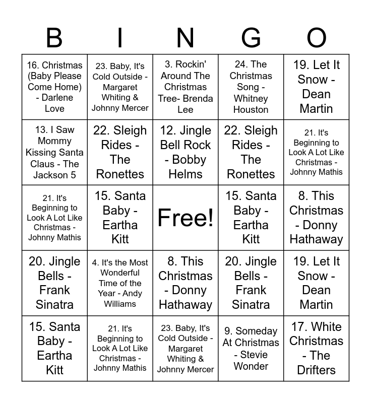⚠ This card has duplicate items: 1. All I Want for Christmas Is You - Mariah Carey (3), 2. Have Yourself A Merry Little Christmas - Luther Vandross (3), 3. Rockin' Around The Christmas Tree- Brenda Lee (3), 4. It's the Most Wonderful Time of the Year - Andy Williams (3), 5. Give Love On Christmas Day - The Jackson 5 (3), 6. Silent Night - The Temptations (3), 7. The Christmas Song - Nat King Cole (3), 8. This Christmas - Donny Hathaway (3), 9. Someday At Christmas - Stevie Wonder (3), 10. Santa Claus Is Coming To Town - The Jackson 5 (3), 11. Let It Snow - Boys II Men/ Brian Mcknight (3), 12. Rudolph The Red-Nosed Reindeer - The Temptations (3), 12. Jingle Bell Rock - Bobby Helms (3), 13. I Saw Mommy Kissing Santa Claus - The Jackson 5 (3), 14. Joy To The World - Whitney Houston (3), 15. Santa Baby - Eartha Kitt (3), 16. Christmas (Baby Please Come Home) - Darlene Love (3), 17. White Christmas - The Drifters (3), 18. What Christmas Means To Me - Stevie Wonder (3), 19. Let It Snow - Dean Martin (3), 20. Jingle Bells - Frank Sinatra (3), 21. It's Beginning to Look A Lot Like Christmas - Johnny Mathis (3), 22. Sleigh Rides - The Ronettes (3), 23. Baby, It's Cold Outside - Margaret Whiting & Johnny Mercer (3), 24. The Christmas Song - Whitney Houston (3)