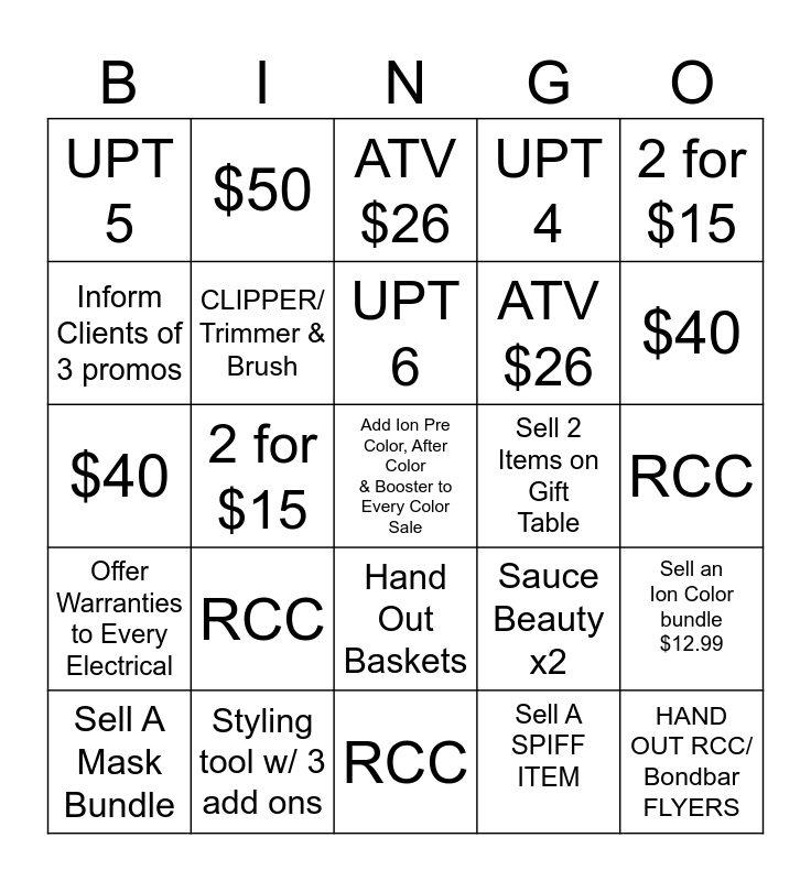 This bingo card has a free space and 24 words: RCC, Styling tool w/ 3 add ons, UPT 6, Sell A Mask Bundle, 2 for $15, UPT 5, Inform Clients of 3 promos, $50, Sell 2 Items on Gift Table, Hand Out Baskets, ATV $26, $40, Sauce Beauty x2, Sell an Ion Color bundle $12.99, CLIPPER/ Trimmer & Brush, Sell A SPIFF ITEM, RCC, ATV $26, $40, 2 for $15, HAND OUT RCC/ Bondbar FLYERS, Offer Warranties to Every Electrical, UPT 4 and RCC.