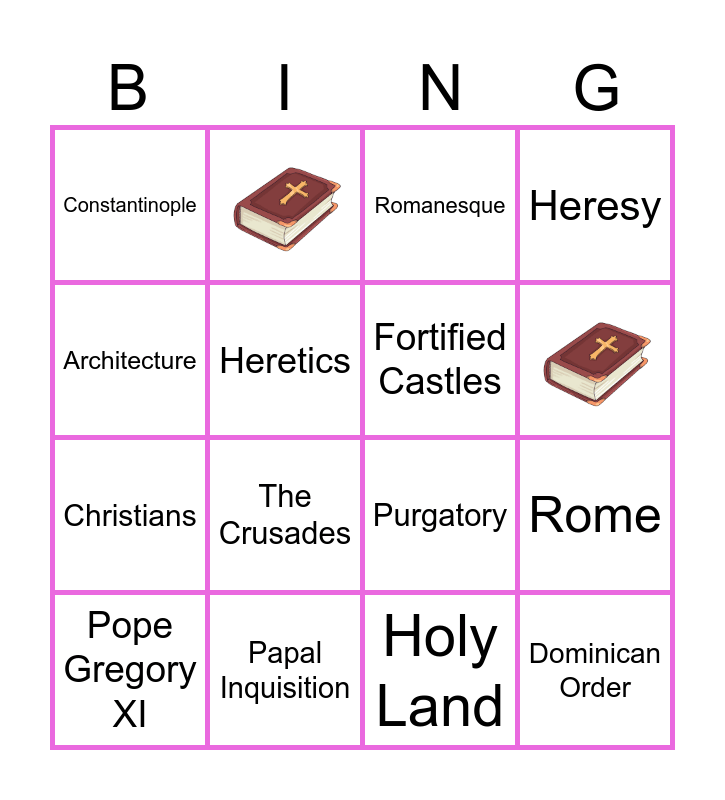 This bingo card has 2 images and 14 words: Pope Gregory XI, Papal Inquisition, Romanesque, Heresy, Architecture, Purgatory, Rome, Constantinople, Heretics, Holy Land, Christians, The Crusades, Fortified Castles and Dominican Order.
