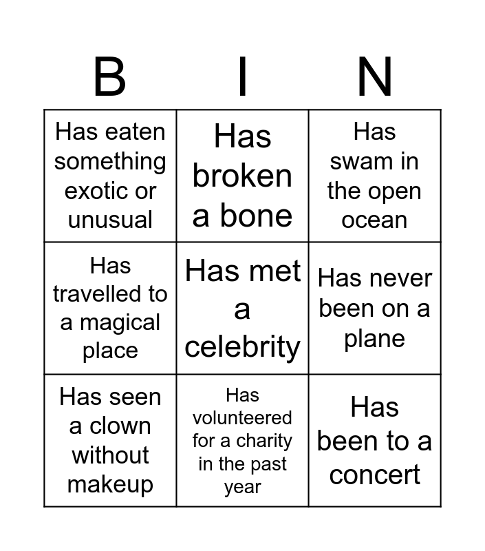 This bingo card has a free space and 8 words: Has travelled to a magical place, Has broken a bone, Has never been on a plane, Has seen a clown without makeup, Has swam in the open ocean, Has eaten something exotic or unusual, Has volunteered for a charity in the past year and Has been to a concert.