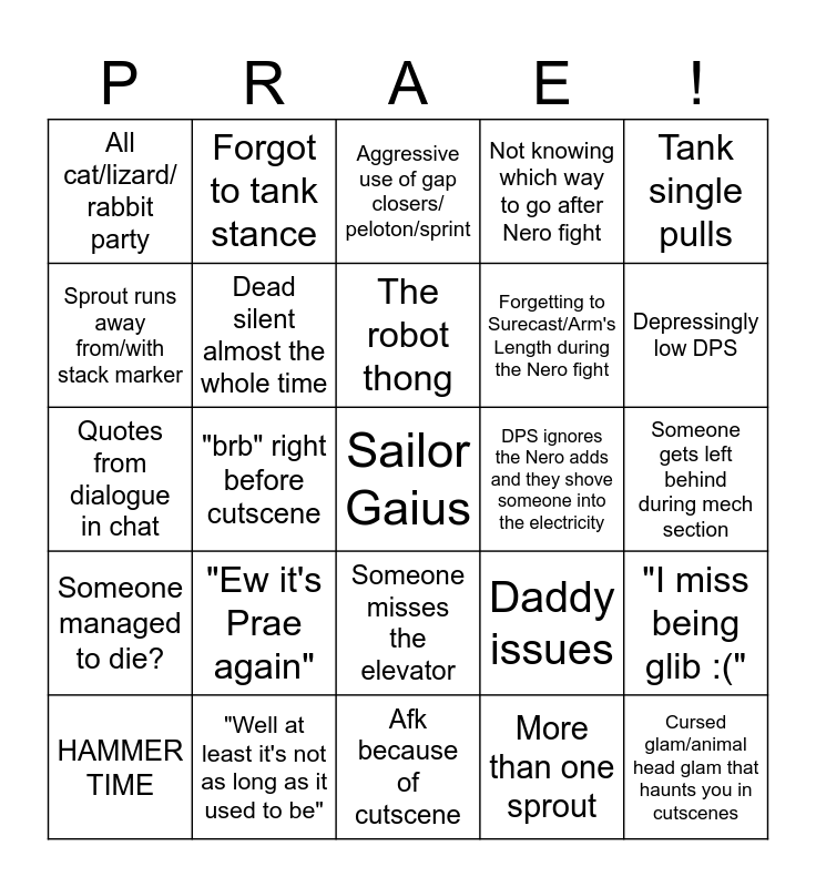 This bingo card has a free space and 24 words: "Ew it's Prae again", "Well at least it's not as long as it used to be", The robot thong, HAMMER TIME, Tank single pulls, All cat/lizard/ rabbit party, Sprout runs away from/with stack marker, Forgot to tank stance, DPS ignores the Nero adds and they shove someone into the electricity, Someone misses the elevator, Forgetting to Surecast/Arm's Length during the Nero fight, Quotes from dialogue in chat, Daddy issues, "I miss being glib :(", Dead silent almost the whole time, More than one sprout, Someone gets left behind during mech section, Aggressive use of gap closers/ peloton/sprint, Depressingly low DPS, "brb" right before cutscene, Cursed glam/animal head glam that haunts you in cutscenes, Someone managed to die?, Not knowing which way to go after Nero fight and Afk because of cutscene.