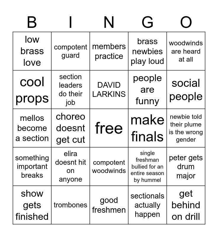 This bingo card has a free space and 29 words: naomi is present, trombones, members practice, flugels, woodwinds are heard at all, low brass love, section leaders do their job, DAVID LARKINS, make finals, peter gets drum major, show gets finished, choreo doesnt get cut, sectionals actually happen, get behind on drill, mellos become a section, alden is present, good freshmen, single freshman bullied for an entire season by hummel, social people, something important breaks, elira doesnt hit on anyone, no lecture every week, people are funny, newbie told their plume is the wrong gender, cool props, compotent guard, compotent woodwinds, brass newbies play loud and good season.