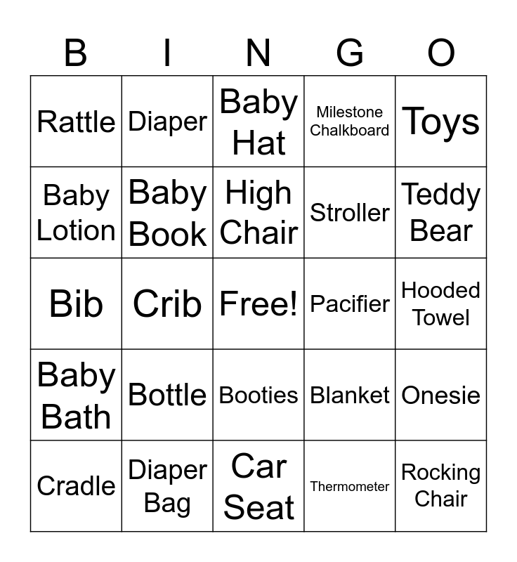 This bingo card has a free space and 25 words: Bottle, Car Seat, High Chair, Cradle, Toys, Rattle, Baby Lotion, Diaper, Pacifier, Booties, Stroller, Bib, Blanket, Onesie, Baby Book, Baby Socks, Hooded Towel, Baby Hat, Teddy Bear, Crib, Rocking Chair, Diaper Bag, Baby Bath, Milestone Chalkboard and Thermometer.