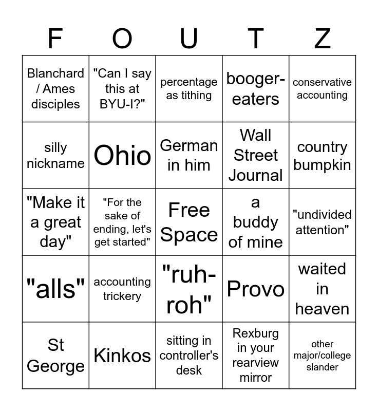 This bingo card has a free space and 24 words: accounting trickery, Kinkos, German in him, St George, conservative accounting, Blanchard / Ames disciples, silly nickname, "Can I say this at BYU-I?", a buddy of mine, "ruh-roh", Wall Street Journal, "Make it a great day", Provo, waited in heaven, Ohio, Rexburg in your rearview mirror, "undivided attention", percentage as tithing, country bumpkin, "For the sake of ending, let's get started", other major/college slander, "alls", booger-eaters and sitting in controller's desk.