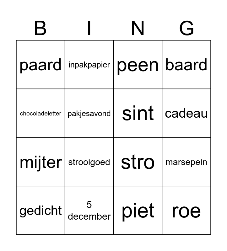 This bingo card has 21 words: 5 december, pepernoot, inpakpapier, boot, piet, sint, paard, peen, stro, cadeau, mijter, baard, roe, spanje, pakjesavond, surprise, gedicht, strooigoed, chocoladeletter, marsepein and banketstaaf.