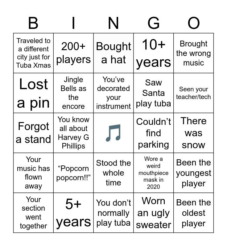 This bingo card has a free space and 24 words: “Popcorn popcorn!!”, 5+ years, You’ve decorated your instrument, Your section went together, Brought the wrong music, Traveled to a different city just for Tuba Xmas, Lost a pin, 200+ players, Couldn’t find parking, Stood the whole time, Saw Santa play tuba, Forgot a stand, Wore a weird mouthpiece mask in 2020, Been the youngest player, Jingle Bells as the encore, Worn an ugly sweater, There was snow, Bought a hat, Seen your teacher/tech, You know all about Harvey G Phillips, Been the oldest player, Your music has flown away, 10+ years and You don’t normally play tuba.