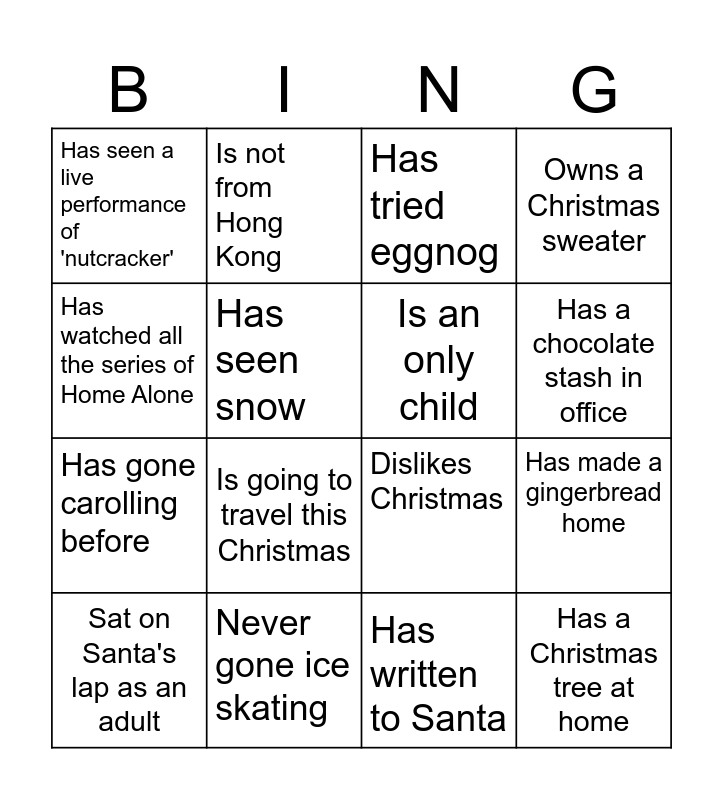 This bingo card has 16 words: Never gone ice skating, Has made a gingerbread home, Has tried eggnog, Has seen a live performance of 'nutcracker', Has gone carolling before, Is not from Hong Kong, Dislikes Christmas, Has written to Santa, Has watched all the series of Home Alone, Has seen snow, Sat on Santa's lap as an adult, Owns a Christmas sweater, Is going to travel this Christmas, Has a chocolate stash in office, Is an only child and Has a Christmas tree at home.