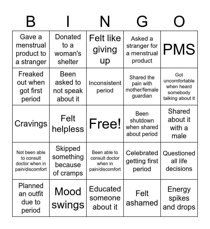 This bingo card has a free space and 24 words: Skipped something because of cramps, Mood swings, Inconsistent period, Planned an outfit due to period, PMS, Gave a menstrual product to a stranger, Freaked out when got first period, Donated to a woman's shelter, Been shutdown when shared about period, Been able to consult doctor when in pain/discomfort, Shared the pain with mother/female guardian, Cravings, Celebrated getting first period, Questioned all life decisions, Been asked to not speak about it, Felt ashamed, Shared about it with a male, Felt like giving up, Got uncomfortable when heard somebody talking about it, Felt helpless, Energy spikes and drops, Not been able to consult doctor when in pain/discomfort, Asked a stranger for a menstrual product and Educated someone about it.