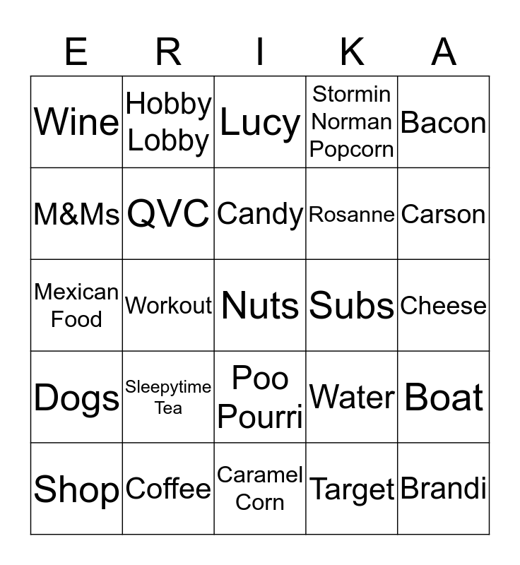 This bingo card has a free space and 24 words: Sleepytime Tea, Coffee, Candy, Shop, Bacon, Wine, M&Ms, Hobby Lobby, Subs, Poo Pourri, Rosanne, Mexican Food, Water, Boat, QVC, Target, Cheese, Lucy, Carson, Workout, Brandi, Dogs, Stormin Norman Popcorn and Caramel Corn.