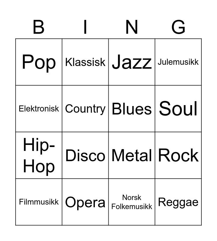 This bingo card has 16 words: Opera, Rock, Jazz, Pop, Hip-Hop, Klassisk, Metal, Norsk Folkemusikk, Elektronisk, Country, Filmmusikk, Julemusikk, Disco, Soul, Blues and Reggae.