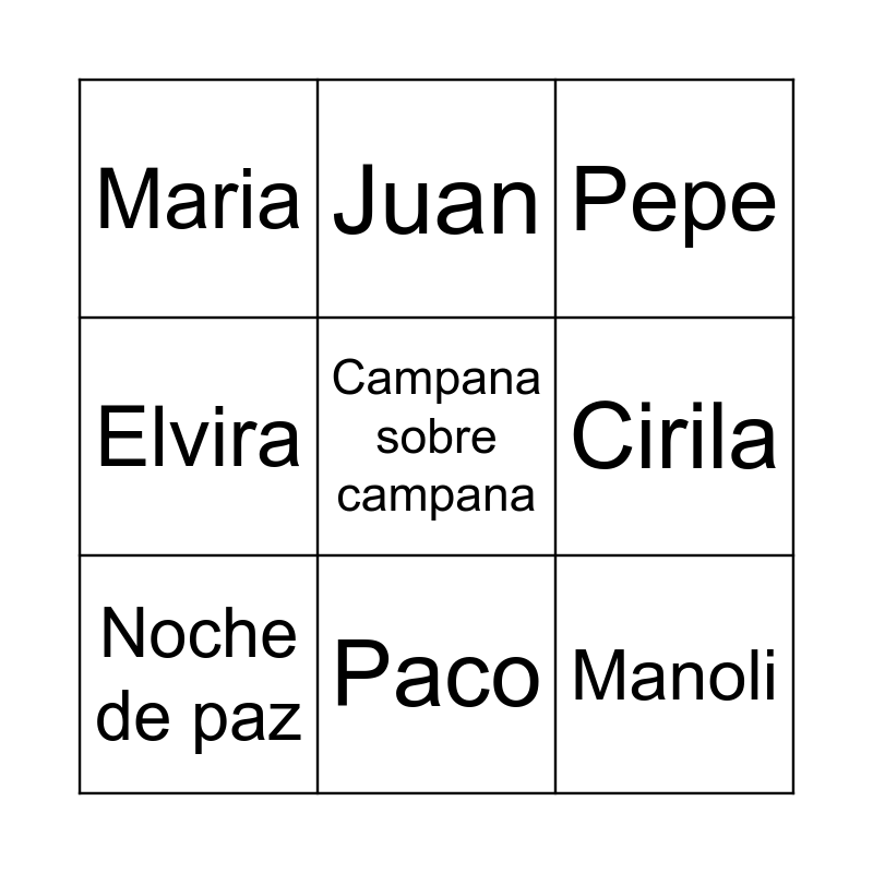 This bingo card has a free space and 8 words: Cirila, Pepe, Juan, Noche de paz, Maria, Manoli, Elvira and Paco.