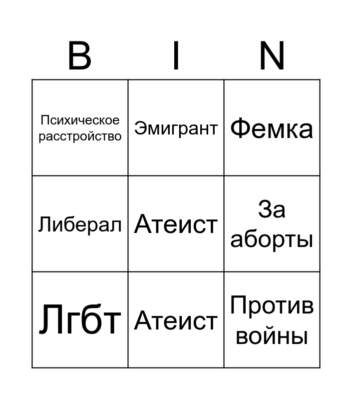 This bingo card has a free space and 9 words: Лгбт, Фемка, Эмигрант, Либерал, Психическое расстройство, За аборты, Против войны, Уклонист and Атеист.