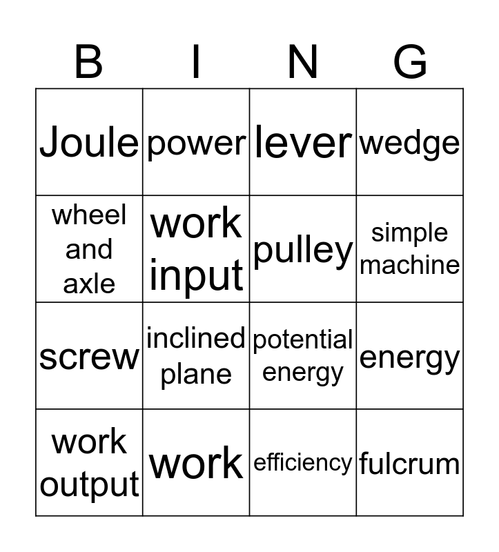 This bingo card has a free space and 15 words: work output, fulcrum, lever, Joule, simple machine, wheel and axle, inclined plane, efficiency, work input, screw, energy, wedge, pulley, power and work.