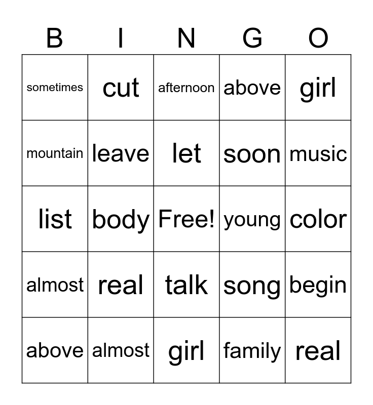 This bingo card has a free space and 24 words: real, almost, let, above, girl, sometimes, mountain, cut, young, talk, soon, list, song, begin, leave, family, color, afternoon, music, body, real, almost, above and girl.