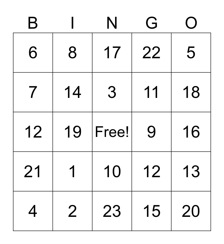 This bingo card has a free space and 24 words: 1, 2, 3, 4, 5, 6, 7, 8, 9, 10, 11, 12, 12, 13, 14, 15, 16, 17, 18, 19, 20, 21, 22 and 23.