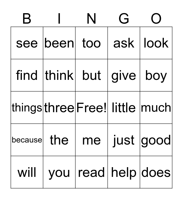 This bingo card has a free space and 24 words: the, you, but, will, look, see, find, been, little, me, give, things, just, good, think, help, much, too, boy, three, does, because, ask and read.