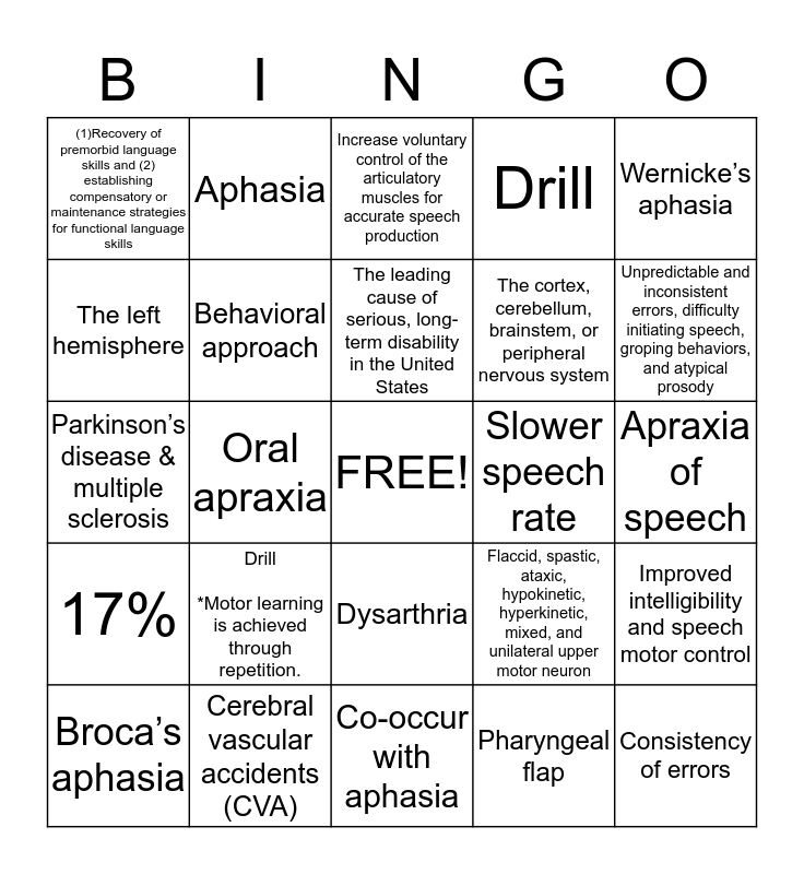 This bingo card has a free space and 24 words: Drill *Motor learning is achieved through repetition., Cerebral vascular accidents (CVA), The leading cause of serious, long-term disability in the United States, Broca’s aphasia, Wernicke’s aphasia, (1)Recovery of premorbid language skills and (2) establishing compensatory or maintenance strategies for functional language skills, The left hemisphere, Aphasia, Slower speech rate, Dysarthria, The cortex, cerebellum, brainstem, or peripheral nervous system, Parkinson’s disease & multiple sclerosis, Flaccid, spastic, ataxic, hypokinetic, hyperkinetic, mixed, and unilateral upper motor neuron, Improved intelligibility and speech motor control, Behavioral approach, Pharyngeal flap, Apraxia of speech, Increase voluntary control of the articulatory muscles for accurate speech production, Unpredictable and inconsistent errors, difficulty initiating speech, groping behaviors, and atypical prosody, Oral apraxia, Consistency of errors, 17%, Drill and Co-occur with aphasia.