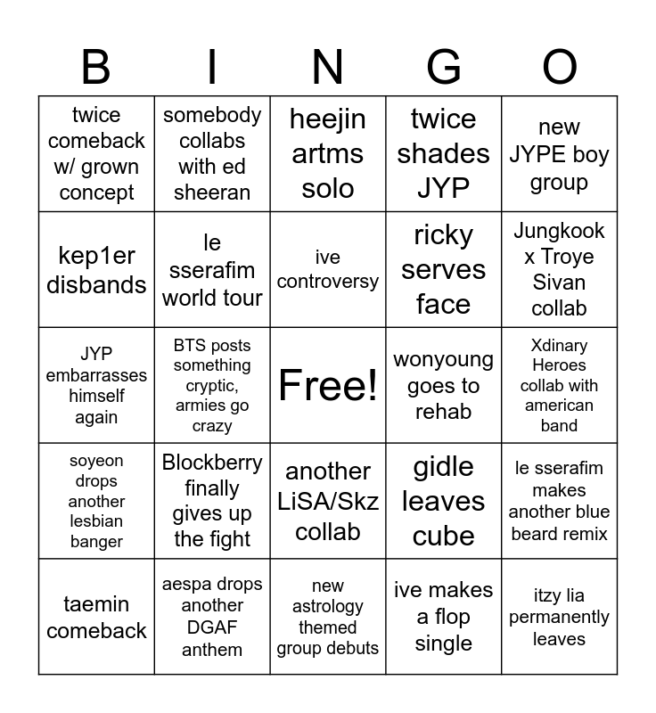 This bingo card has a free space and 24 words: Blockberry finally gives up the fight, aespa drops another DGAF anthem, ive controversy, taemin comeback, new JYPE boy group, twice comeback w/ grown concept, kep1er disbands, somebody collabs with ed sheeran, wonyoung goes to rehab, another LiSA/Skz collab, ricky serves face, JYP embarrasses himself again, gidle leaves cube, le sserafim makes another blue beard remix, le sserafim world tour, ive makes a flop single, Xdinary Heroes collab with american band, heejin artms solo, Jungkook x Troye Sivan collab, BTS posts something cryptic, armies go crazy, itzy lia permanently leaves, soyeon drops another lesbian banger, twice shades JYP and new astrology themed group debuts.
