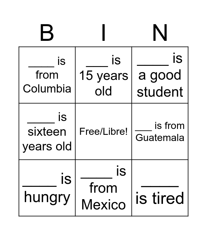 This bingo card has a free space and 8 words: ___ is from Guatemala, ____ is a good student, ___ is 15 years old, ____ is hungry, ____ is from Columbia, ____ is tired, ____ is sixteen years old and ____ is from Mexico.