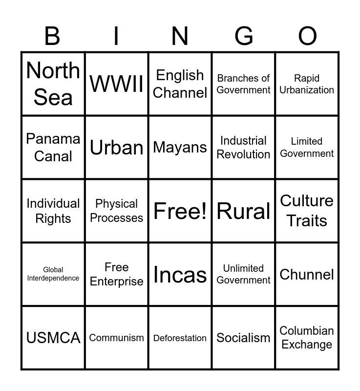 This bingo card has a free space and 24 words: Free Enterprise, Communism, Mayans, USMCA, Rapid Urbanization, North Sea, Panama Canal, WWII, Rural, Incas, Industrial Revolution, Individual Rights, Unlimited Government, Chunnel, Urban, Socialism, Culture Traits, English Channel, Limited Government, Physical Processes, Columbian Exchange, Global Interdependence, Branches of Government and Deforestation.